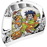 Icon Shakki Men's Alliance Street Racing Motorcycle Helmet - White / X-Small. The Shakki helmet is adorned with many Japanese mythological elements. Each element features a character that represents a trait or story. Endurance - The Monk Mongaku tests his spiritual sincerity by standing under an ice cold waterfall. Exposure to the frigid water almost kills him, but he perseveres showing his mental and physical endurance. Bravery - Kintaro, also known as the Golden Boy, roamed the forests of northern Japan. He was renowned for his strength and mastery of the wild. Often his bravery is depicted by wrestling the feared giant carp. Raijin - With his ability to create the most powerful storms, Raijin rains down deafening thunder from his multitude of drums. Usually depicted as a red demonic demon, he is both feared and admired as a predominate deity in the Shinto religion. Fujin - Shouldering his bag of wind, the disheveled Fujin has the power to both create and destroy. As the god of wind, he is among the oldest of the Shinto gods, and helped create the world itself.